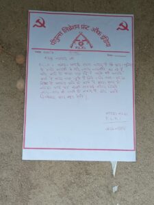 पर्चे में लिखा गया है कि “आप हमारे आदमी के साथ ज्यादा राजनीति कर रहे हैं और हमारे काम में बाधा डाल रहे हैं। पहले भी आपने ऐसा किया था, जिसे संगठन ने नजरअंदाज कर दिया था, लेकिन अब यदि फिर से राजनीति की तो आपके जान-माल को नुकसान पहुंचाया जाएगा।”