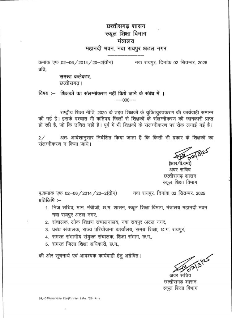 शिक्षा विभाग के अवर सचिव आर. पी. वर्मा ने पत्र जारी करते हुए सभी जिलों के कलेक्टरों को निर्देशित किया है कि किसी भी प्रकार से शिक्षकों का संल्नीकरण नहीं किया जाए।