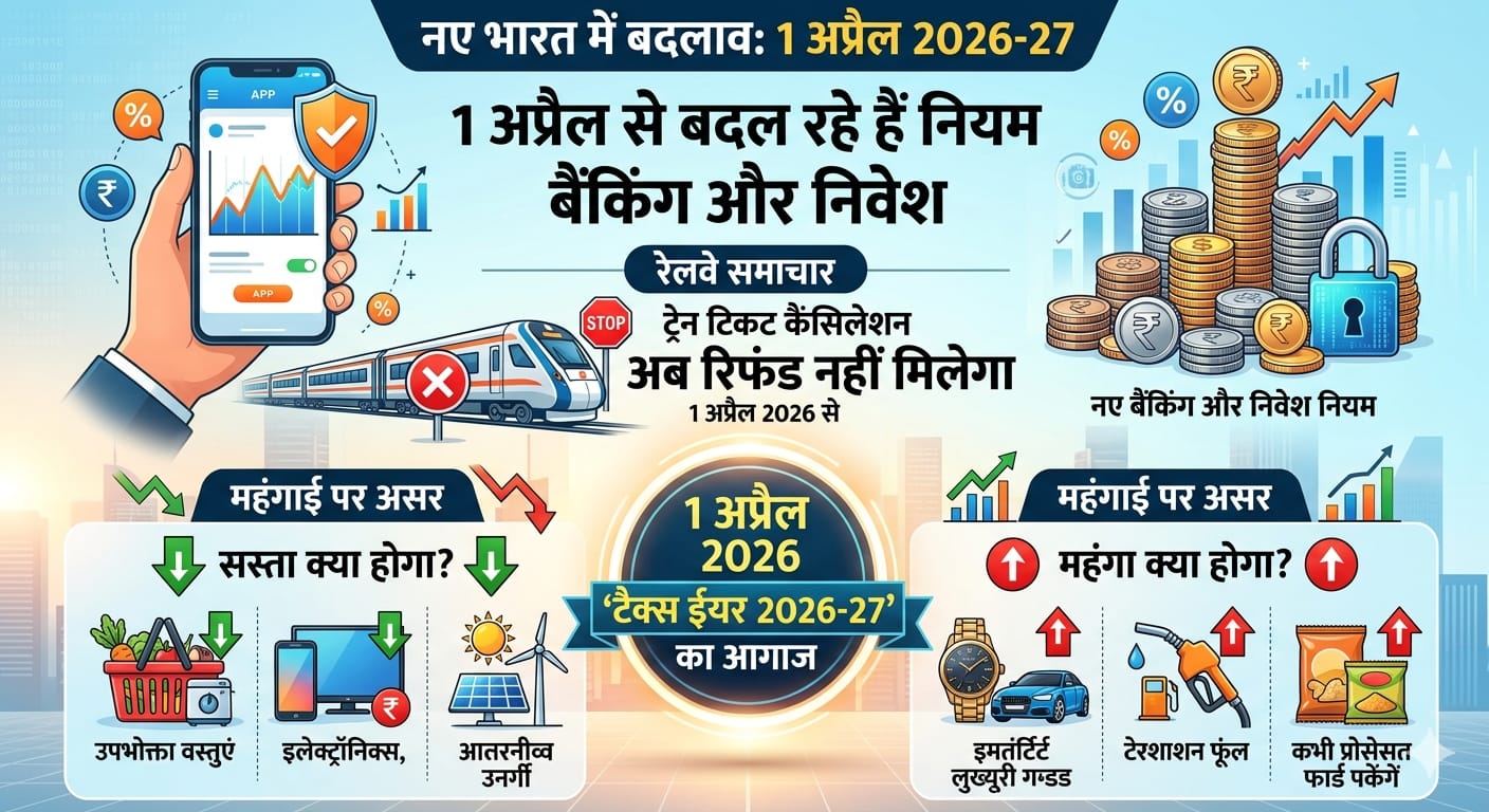 नई दिल्ली/रायपुर: आज से नए वित्त वर्ष (2026-27) का आगाज हो गया है। 1 अप्रैल की सुबह होते ही देश में बैंकिंग, रेलवे, हाईवे और टैक्स से जुड़े कई बड़े बदलाव लागू हो गए हैं। इन नियमों का सीधा असर आम आदमी के बजट और रोजमर्रा के कामों पर पड़ेगा। आइए जानते हैं विस्तार से कि आज से क्या-क्या बदल गया है।