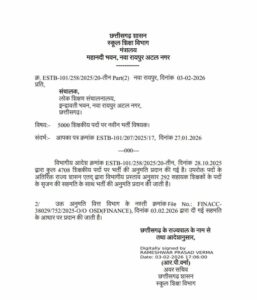 रायपुर, छत्तीसगढ़: प्रदेश के युवाओं और शिक्षा क्षेत्र के लिए एक बड़ी खुशखबरी सामने आई है। छत्तीसगढ़ स्कूल शिक्षा विभाग ने राज्य में 5000 शिक्षकीय पदों पर भर्ती की अनुमति प्रदान कर दी है। इस संबंध में संचालक, लोकशिक्षण संचालनालय को आधिकारिक आदेश जारी कर दिया गया है, जिससे हजारों अभ्यर्थियों को राहत मिली है।