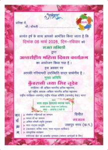 जशपुर नगर, छत्तीसगढ़: सजल सखियों द्वारा जशपुर नगर में अंतर्राष्ट्रीय महिला दिवस के उपलक्ष्य में एक भव्य कार्यक्रम का आयोजन किया जा रहा है। यह समारोह दिनांक 08 मार्च 2026, दिन रविवार को अपराह्न 3 बजे से कल्याण आश्रम स्थित “बाला साहब देशपांडे स्मारक भवन” में आयोजित होगा।