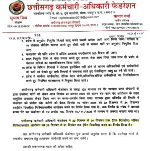 रायपुर। महंगाई भत्ता (DA/DR), वेतन विसंगतियाँ, कैशलेस चिकित्सा सुविधा व नियमितिकरण सहित 11 सूत्रीय मांगों को लेकर छत्तीसगढ़ कर्मचारी-अधिकारी फेडरेशन ने 29, 30 और 31 दिसंबर को तीन दिवसीय कामबंद–कलमबंद आंदोलन का ऐलान कर दिया है।