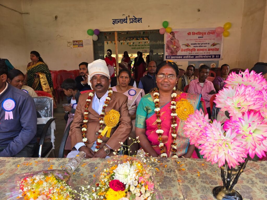 जशपुर। विकास खंड मनोरा के लोकप्रिय वरिष्ठ प्राचार्य तिनतियुस टोप्पो को शासकीय उच्चतर माध्यमिक शाला खरसोता के प्रांगण में शाला प्रबंधन एवं विकास समिति के सदस्यों शिक्षकों ग्राम वासियों छात्रों अभिभावकों के द्वारा विदाई दी गयी।
