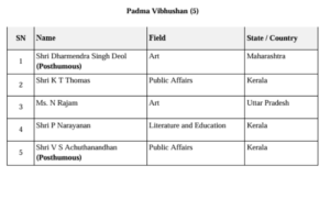 पद्म विभूषण से सम्मानित होने वालों में दिवंगत अभिनेता धर्मेंद्र सिंह देओल (कला), वी. एस. अच्युतानंदन (लोक कार्य, मरणोपरांत), के. टी. थॉमस, एन. राजम और पी. नारायणन शामिल हैं।