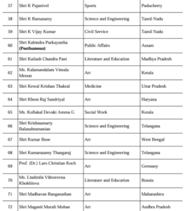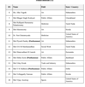 वहीं पद्म भूषण पाने वालों में गायिका अलका याग्निक, अभिनेता ममूटी, उद्योगपति उदय कोटक, पूर्व मुख्यमंत्री भगत सिंह कोश्यारी, विजय अमृतराज, वेल्लापल्ली नटेशन सहित कुल 13 हस्तियां शामिल हैं।