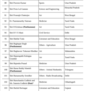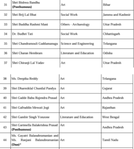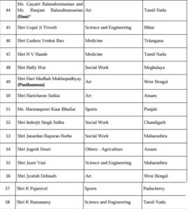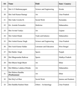 खेल जगत से रोहित शर्मा और हरमनप्रीत कौर को पद्म श्री से सम्मानित किया जाएगा। इसके अलावा देश के अलग-अलग कोनों से आए कई ऐसे लोगों को भी पद्म श्री दिया गया है, जिन्होंने बिना किसी पहचान के समाज सेवा में जीवन लगा दिया। कर्नाटक के अंके गौड़ा, जिन्होंने दुनिया का सबसे बड़ा निशुल्क पुस्तकालय स्थापित किया, और मुंबई की बाल रोग विशेषज्ञ आर्मिडा फर्नांडिस, जिन्होंने एशिया का पहला मानव दूध बैंक शुरू किया, को “गुमनाम नायकों” की श्रेणी में सम्मानित किया गया है। छत्तीसगढ़ की बुदरी थाटी और रामचंद्र गोडबोले-सुनीता गोडबोले का नाम भी इस सूची में शामिल है।