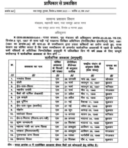 रायपुर। छत्तीसगढ़ सरकार ने वर्ष 2026 के लिए शासकीय अवकाशों की आधिकारिक सूची जारी कर दी है। सामान्य प्रशासन विभाग द्वारा जारी अधिसूचना के अनुसार यह अवकाश सूची गजट में प्रकाशित कर दी गई है और अब यह सभी शासकीय कार्यालयों, शैक्षणिक संस्थानों और विभागों में लागू होगी। नए साल में सरकारी कर्मचारियों और शिक्षकों को कुल 107 दिनों की छुट्टियों का लाभ मिलेगा, जिससे वर्ष 2026 को राहत भरा साल माना जा रहा है।