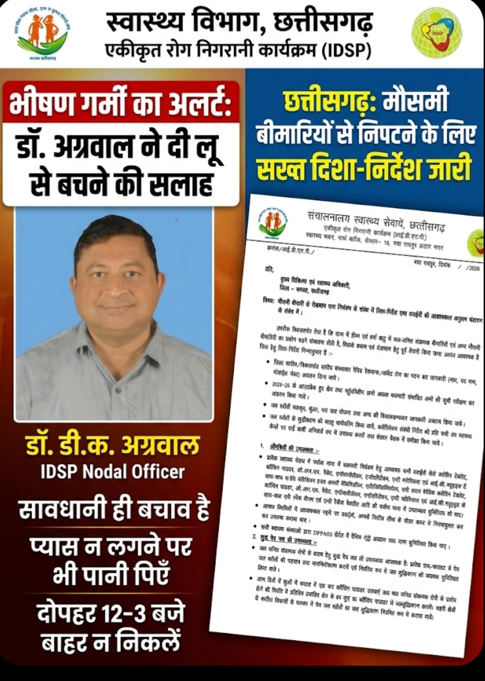 भीषण गर्मी की दस्तक और पारा चढ़ने के साथ ही छत्तीसगढ़ शासन और स्वास्थ्य विभाग पूरी तरह से सतर्क हो गया है। बढ़ते तापमान और लू (Heat Wave) के खतरों को देखते हुए प्रदेश भर में विस्तृत गाइडलाइन जारी की गई है। जशपुर के प्रसिद्ध चिकित्सक और आईडीएसपी (IDSP) के नोडल अधिकारी डॉ. डी. के. अग्रवाल ने नागरिकों को आगाह किया है कि इस मौसम में छोटी सी लापरवाही जानलेवा साबित हो सकती है, इसलिए ‘सावधानी ही एकमात्र बचाव’ है।