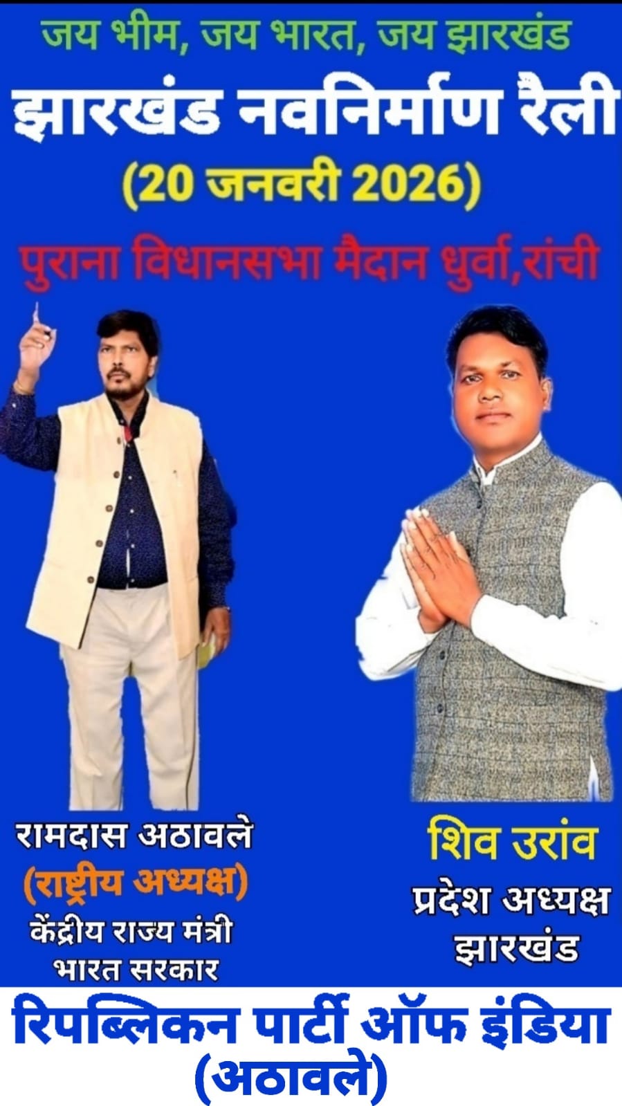 रिपब्लिकन पार्टी ऑफ इंडिया अठावले के बैनर तले 20 जनवरी 2026 को रांची में झारखंड नव निर्माण रैली का आयोजन किया जा रहा है। यह रैली पुराने विधानसभा मैदान धुर्वा में आयोजित होगी। आयोजन को लेकर पार्टी कार्यकर्ताओं और समर्थकों में खासा उत्साह देखा जा रहा है।