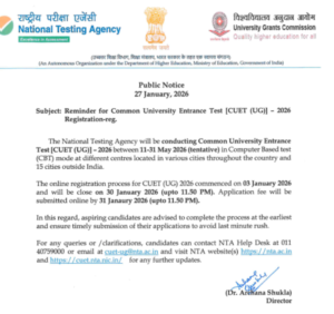 कॉमन यूनिवर्सिटी एंट्रेंस टेस्ट (CUET UG) 2026 में शामिल होने की तैयारी कर रहे छात्रों के लिए अहम खबर है। राष्ट्रीय परीक्षा एजेंसी (NTA) ने उम्मीदवारों के लिए एडवाइजरी जारी करते हुए साफ किया है कि आवेदन की अंतिम तिथि बेहद करीब है। एनटीए ने अभ्यर्थियों से अपील की है कि अंतिम समय की तकनीकी परेशानियों से बचने के लिए वे जल्द से जल्द अपना पंजीकरण पूरा कर लें।