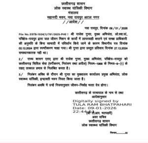 जल जीवन मिशन के कार्यों में लापरवाही और सक्षम प्राधिकारी की अनुमति के बिना सामग्री में बदलाव के गंभीर आरोपों को देखते हुए रायपुर परिक्षेत्र के मुख्य अभियंता राजेश गुप्ता को तत्काल प्रभाव से निलंबित कर दिया गया है। विभाग ने उनके विरुद्ध विभागीय जांच के आदेश जारी करते हुए जांच अधिकारी को एक माह के भीतर प्रतिवेदन प्रस्तुत करने के निर्देश दिए हैं। इस कार्रवाई को मिशन के तहत गुणवत्ता और पारदर्शिता सुनिश्चित करने की दिशा में सख्त संदेश के रूप में देखा जा रहा है।