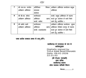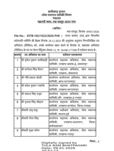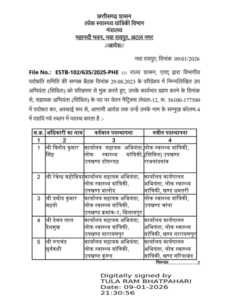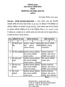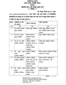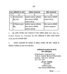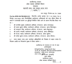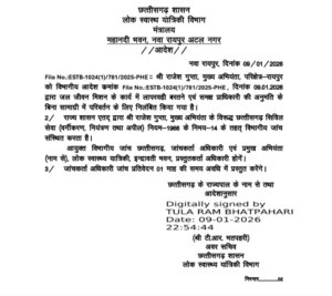 राज्य शासन ने जल जीवन मिशन के कार्यों में गति लाने और लोक स्वास्थ्य यांत्रिकी विभाग की कार्यप्रणाली को अधिक प्रभावी बनाने के लिए बड़ा प्रशासनिक कदम उठाया है। उप मुख्यमंत्री एवं लोक स्वास्थ्य यांत्रिकी मंत्री अरुण साव के निर्देश पर विभाग में व्यापक स्तर पर फेरबदल किया गया है। इसके तहत राज्य कार्यालय, जल जीवन मिशन मुख्यालय और मैदानी कार्यालयों में पदस्थ 34 अधिकारियों के तबादले और दायित्वों में परिवर्तन के आदेश जारी किए गए हैं। साथ ही 26 उप अभियंताओं को सहायक अभियंता के पद पर पदोन्नति दी गई है, जबकि लापरवाही के आरोपों में निलंबित 6 कार्यपालन अभियंताओं की बहाली भी की गई है।