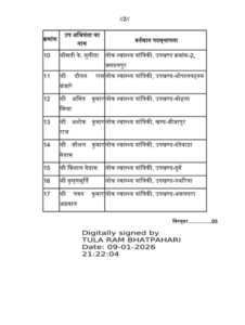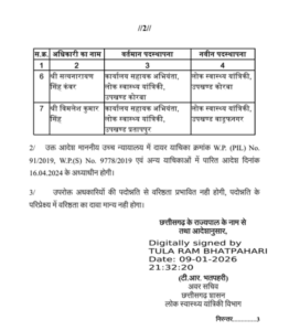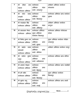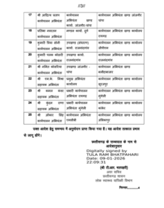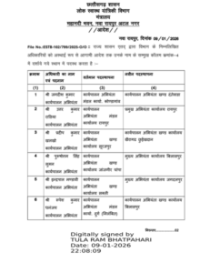 प्रशासनिक फेरबदल के तहत कई वरिष्ठ अधिकारियों को नई जिम्मेदारियां सौंपी गई हैं। प्रभारी प्रमुख अभियंता ओंकेश चंद्रवंशी को वर्तमान दायित्वों के साथ जल जीवन मिशन का अतिरिक्त मिशन संचालक बनाया गया है। मंत्रालय में विभागीय ओएसडी के रूप में पदस्थ मुख्य अभियंता के.के. मरकाम को रायपुर परिक्षेत्र का मुख्य अभियंता नियुक्त किया गया है। कोंडागांव मंडल के अधीक्षण अभियंता और प्रभारी मुख्य अभियंता जगदलपुर परिक्षेत्र के रूप में कार्यरत जी.एल. लखेरा को प्रभारी मुख्य अभियंता जगदलपुर परिक्षेत्र की जिम्मेदारी सौंपी गई है। मुख्य अभियंता कार्यालय रायपुर में पदस्थ अधीक्षण अभियंता राजेन्द्र कुमार शुक्ला को कोंडागांव मंडल का अधीक्षण अभियंता बनाया गया है। जल जीवन मिशन के अतिरिक्त मिशन संचालक एस.एन. पाण्डेय को प्रमुख अभियंता कार्यालय में अधीक्षण अभियंता के रूप में पदस्थ किया गया है। कांकेर खंड कार्यालय के अधीक्षण अभियंता बी.एन. भोयर को प्रमुख अभियंता कार्यालय में जल जीवन मिशन के कार्यों के लिए आदेशित किया गया है। वहीं राजनांदगांव से अधीक्षण अभियंता समीर शर्मा का स्थानांतरण कर उन्हें रायपुर स्थित मुख्य अभियंता कार्यालय में जल जीवन मिशन का दायित्व सौंपा गया है। इसके अलावा मैदानी स्तर पर 22 कार्यपालन अभियंताओं और 3 सहायक अभियंताओं के तबादले के आदेश भी जारी किए गए हैं।
