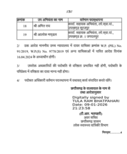 विभाग द्वारा 26 उप अभियंताओं सिविल को सहायक अभियंता सिविल के पद पर पदोन्नति दी गई है। पदोन्नत अधिकारियों में गुणेश कुमार पानीग्रही, सरोतन सिंह पैंकरा, रवि प्रकाश जोशी, प्रणेश कुमार रामटेके, प्रकाश सिंह ठाकुर, गुलाब सिंह चौहान, दौलत राम बंजारे, अमित कुमार मिश्रा, अशोक कुमार राज, कौशल कुमार नेताम, विशाल गेडाम, कृष्णमूर्ति, पवन कुमार अग्रवाल, अमित राय, आलोक मंडल, अंजू साहू, रीना सिंह, सुभ्रा बघेल और के. सुनीता सहित अन्य शामिल हैं। इसके अतिरिक्त सात उप अभियंताओं को परिभ्रमण से मुक्त करते हुए सहायक अभियंता के पद पर पदोन्नत किया गया है। इनमें विनोद कुमार सिंह, रेवेन्द्र महोबिया, प्रमोद कुमार महतो, डेमन लाल देशमुख, रूपचंद सूर्यवंशी, सत्यनारायण सिंह कंवर और विमलेश कुमार सिंह के नाम शामिल हैं।
