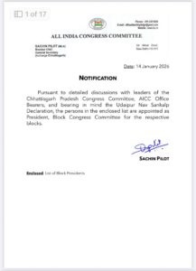 अखिल भारतीय कांग्रेस कमेटी ने छत्तीसगढ़ प्रदेश में संगठनात्मक मजबूती की दिशा में बड़ा कदम उठाते हुए ब्लॉक कांग्रेस कमेटियों के अध्यक्षों की नियुक्ति कर दी है। यह नियुक्तियां AICC महासचिव एवं छत्तीसगढ़ प्रभारी सचिन पायलट द्वारा जारी अधिसूचना के माध्यम से की गई हैं। अधिसूचना दिनांक 14 जनवरी 2026 को नई दिल्ली से जारी की गई