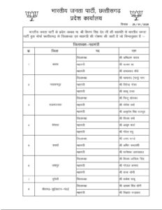 रायपुर । भारतीय जनता पार्टी के प्रदेश अध्यक्ष श्री किरण सिंह देव जी के मार्गदर्शन में भाजपा युवा मोर्चा छत्तीसगढ़ की नई जिला स्तर की टीम की घोषणा 29 जनवरी 2026 को जारी कर दी गई। प्रदेश कार्यालय से जारी इस सूची में विभिन्न जिलों के जिलाध्यक्ष एवं महामंत्रियों के नाम शामिल हैं। पार्टी ने युवा मोर्चा के संगठन को और मजबूत करने के उद्देश्य से युवाओं को अवसर देते हुए संतुलित एवं सक्रिय टीम चयनित की है।
