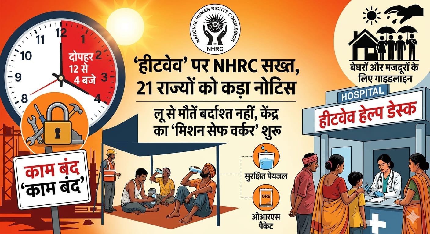 नई दिल्ली: देश भर में जारी भीषण गर्मी और जानलेवा लू (Heatwave) के प्रकोप के बीच केंद्र सरकार ने नागरिकों, विशेषकर श्रमिकों और बेघरों की सुरक्षा के लिए अब तक का सबसे बड़ा सुरक्षा घेरा तैयार किया है। राष्ट्रीय मानवाधिकार आयोग (NHRC) के कड़े रुख के बाद श्रम मंत्रालय और भारतीय राष्ट्रीय राजमार्ग प्राधिकरण (NHAI) ने संयुक्त रूप से ‘मिशन सेफ वर्कर’ के तहत नए राष्ट्रव्यापी निर्देश जारी किए हैं। NHRC ने दिल्ली सहित 21 राज्यों को नोटिस जारी कर आगाह किया है कि पिछले 5 वर्षों में लू से 3,712 लोगों की मौत जीवन के अधिकार पर सीधा प्रहार है। इसी गंभीरता को देखते हुए श्रम मंत्रालय ने सभी राज्यों को काम के घंटों में लचीलापन लाने और दोपहर की तीखी धूप के दौरान अनिवार्य ‘ब्रेक’ देने का आदेश दिया है।