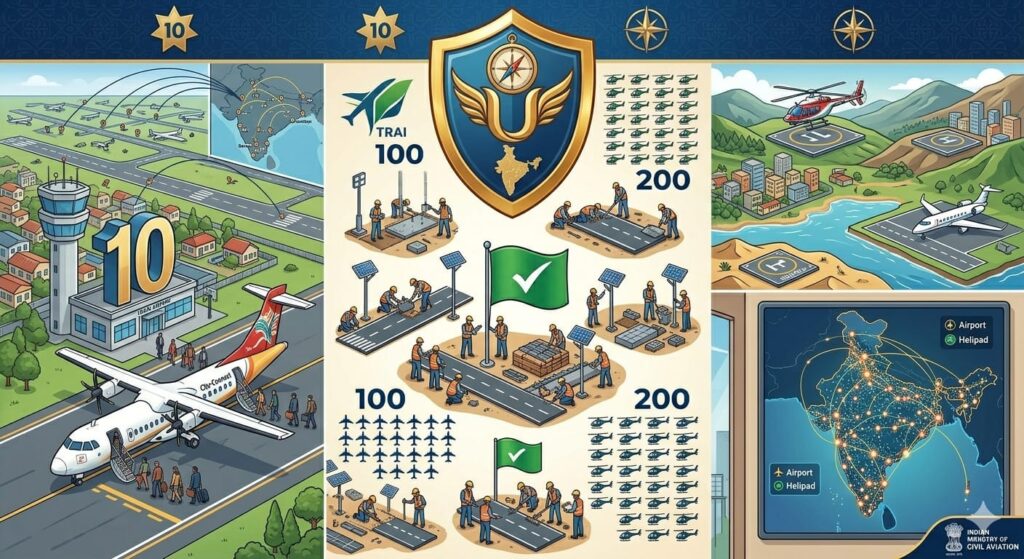 विकसित भारत 2047 के विजन को ध्यान में रखते हुए, सरकार अगले आठ वर्षों में 12,159 करोड़ रुपये खर्च करके 100 नए हवाई अड्डों का विकास करेगी। ये हवाई अड्डे उन क्षेत्रों में बनाए जाएंगे जहाँ वर्तमान में हवाई पट्टियां तो हैं लेकिन वहां से उड़ानें संचालित नहीं हो रही हैं।