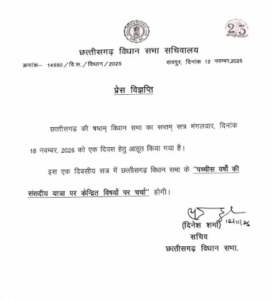 रायपुर। छत्तीसगढ़ विधानसभा का एक दिवसीय विशेष सत्र 18 नवंबर को आयोजित किया जाएगा। यह सत्र राज्य की संसदीय यात्रा के 25 वर्ष पूरे होने के उपलक्ष्य में बुलाया गया है।