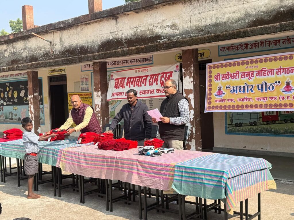 विकासखंड जशपुर के आदर्श शासकीय अनुसूचित जनजाति बालक प्राथमिक शाला आश्रम नीमगांव में बाबा भगवान राम ट्रस्ट सोगड़ा जशपुर एवं श्री सर्वेश्वरी समूह महिला संगठन जशपुर के संयुक्त तत्वावधान में बच्चों को ठंड से बचाव के लिए गर्म कपड़ों का वितरण किया गया