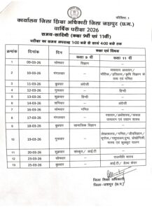 जशपुर। कार्यालय जिला शिक्षा अधिकारी, जशपुर ने शैक्षणिक सत्र 2025-26 के लिए कक्षा 9वीं और 11वीं की वार्षिक परीक्षाओं की समय-सारिणी और दिशा-निर्देश जारी कर दिए हैं।