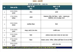 वहीं कक्षा 12वीं की परीक्षा 15 जनवरी को अंग्रेजी से प्रारंभ होकर 29 जनवरी को आईटी/हेल्थ केयर विषय के साथ समाप्त होगी। बीच की तिथियों में हिंदी, राजनीति शास्त्र, अर्थशास्त्र, समाजशास्त्र, विज्ञान, व्यवसाय अध्ययन सहित अन्य विषयों की परीक्षाएं आयोजित की जाएंगी।