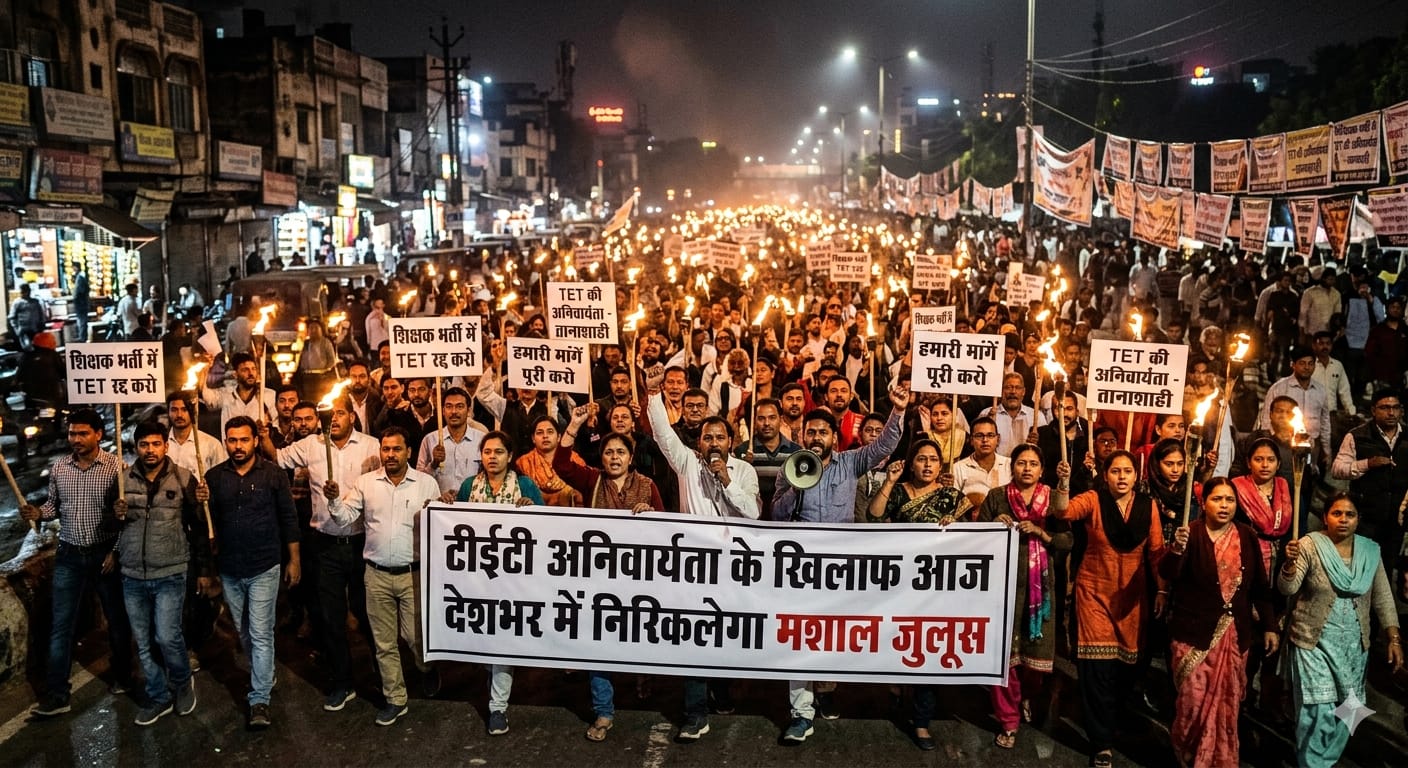 नई दिल्ली अखिल भारतीय संयुक्त शिक्षक महासंघ के आह्वान पर आज, 13 अप्रैल को देशभर के शिक्षक टीईटी (TET) की अनिवार्यता के विरोध में सड़क पर उतरेंगे। महासंघ ने सभी जिला मुख्यालयों पर मशाल जुलूस निकालने का निर्णय लिया है। शिक्षकों की मुख्य मांग है कि शिक्षा का अधिकार अधिनियम (RTE Act) लागू होने से पहले नियुक्त किए गए शिक्षकों को टीईटी की शर्तों से मुक्त रखा जाए।