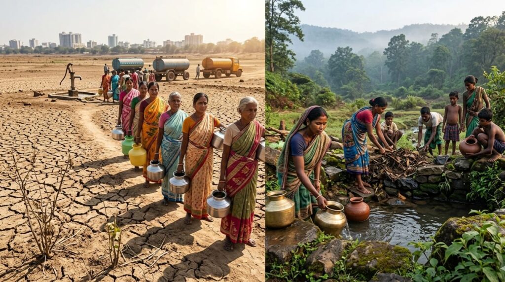 न्यायधानी बिलासपुर की स्थिति भी इससे अलग नहीं है, जहाँ अर्पा नदी का अस्तित्व अब केवल मानसून के कुछ महीनों तक ही सीमित होकर रह गया है। शहर के भीतर गिरता जल स्तर गर्मी की शुरुआत में ही जल संकट का संकेत देने लगा है और अर्पा में बने बैराजों के बावजूद पानी की शुद्धता और उसका ठहराव एक बड़ा यक्ष प्रश्न बना हुआ है। दूसरी ओर, उत्तर छत्तीसगढ़ के सरगुजा और जशपुर जैसे पहाड़ी अंचलों में समस्या पानी की उपलब्धता की नहीं बल्कि उसके संचयन की है। ढलानी भौगोलिक संरचना के कारण बारिश का अधिकांश पानी बहकर नदियों में चला जाता है, जिससे जशपुर के बगीचा और मनोरा जैसे क्षेत्रों के पारंपरिक जल स्रोत ‘झरिया’ और ‘डोंगी’ गर्मियों में तेजी से सूखने लगते हैं। इन वनांचलों में रहने वाले ग्रामीणों को अपनी प्यास बुझाने के लिए मीलों पैदल चलना पड़ता है, जो राज्य के जल प्रबंधन तंत्र की सीमाओं को उजागर करता है।